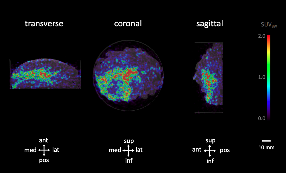 Figure 2. Transverse, coronal and sagittal slices of the PET-CT specimen images of an invasive ductal carcinoma. The 18F-FDG uptake is visible in the color overlay and reaches the inferomedial border of the specimen. Final histopathology confirmed a positive surgical margin. Specimen orientation is as indicated. Abbreviations: med, medial; lat, lateral; sup, superior; inf, inferior.